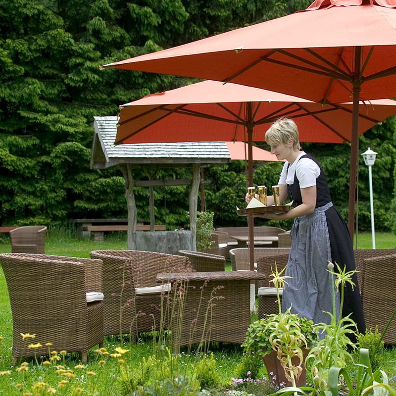 Kellnerin im Hotel-Restaurant Taufstein, welche Bier auf einem Tablet im Garten serviert.