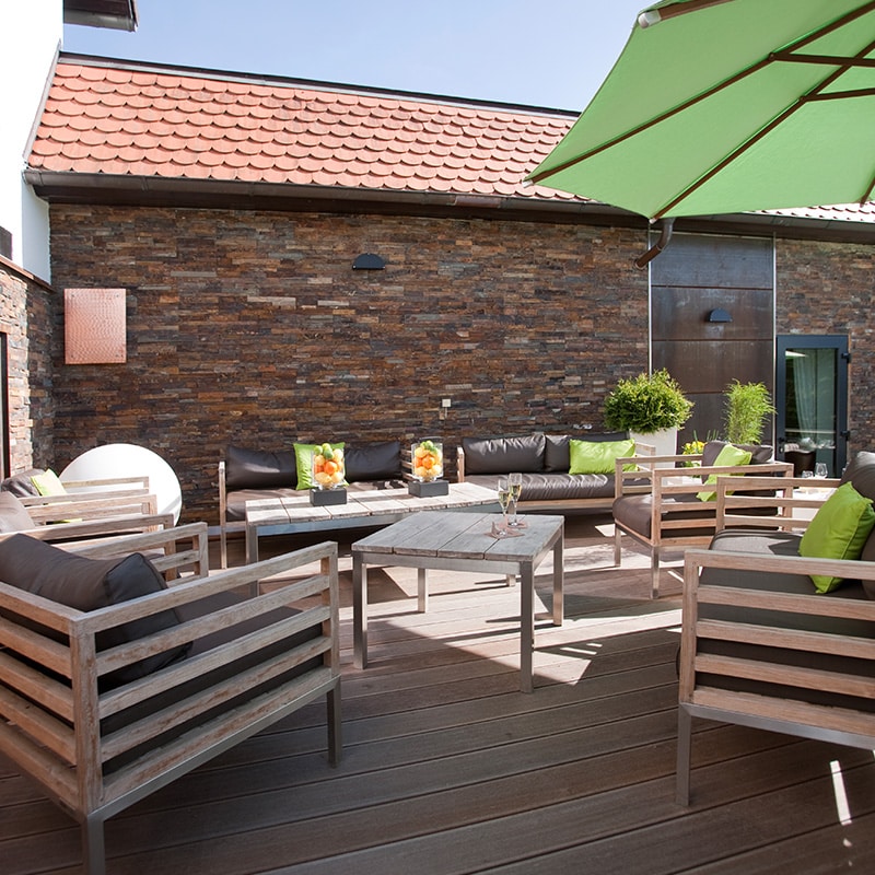 Gemütliche Terrasse vom Hotel-Restaurant Taufstein mit Loungemöbeln.