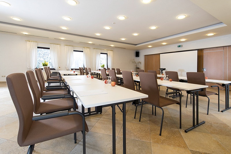 Großer, heller Tagungsraum mit Flipcharts und großen Fenstern.